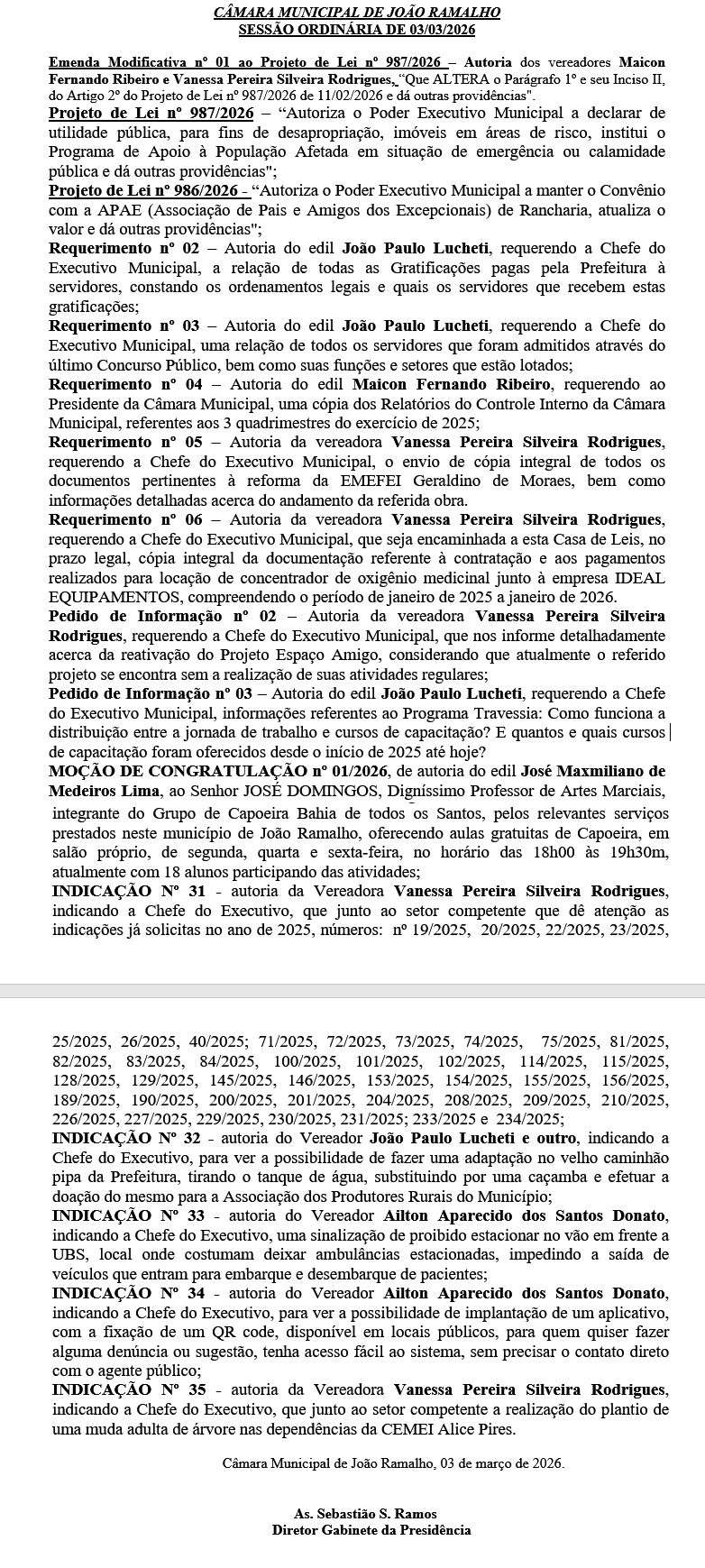 CÂMARA MUNICIPAL DE JOÃO RAMALHO SESSÃO ORDINÁRIA DE 03/03/2026