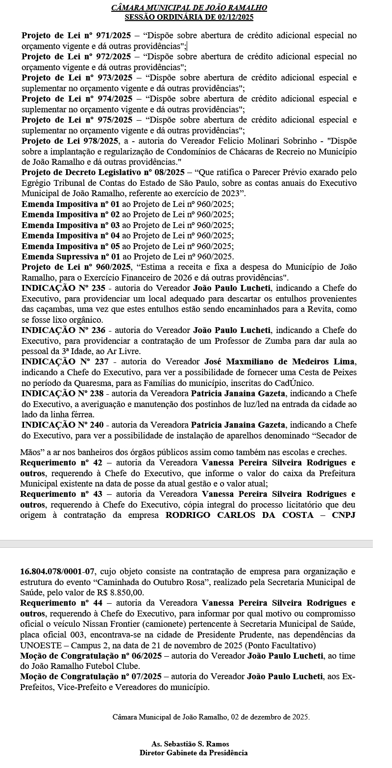 CÂMARA MUNICIPAL DE JOÃO RAMALHO SESSÃO ORDINÁRIA DE 02/12/2025